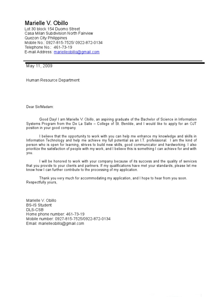 Job Application Letter Sample For Ojt - Whether you're looking for a way to gather model releases, activity waivers, parental consent, or medical consent forms, you can start …. Prospecting letters are similar to cover letters in that they're written in hopes of ultimately generating an interview; Download the letter template (compatible with google docs and word online) or see below for more examples. Review the job description, research the restaurant, and use your education and work experience to explain why you are the perfect candidate for the positon. A lot of people search for sample letters online. As long as it's related to the job ad.